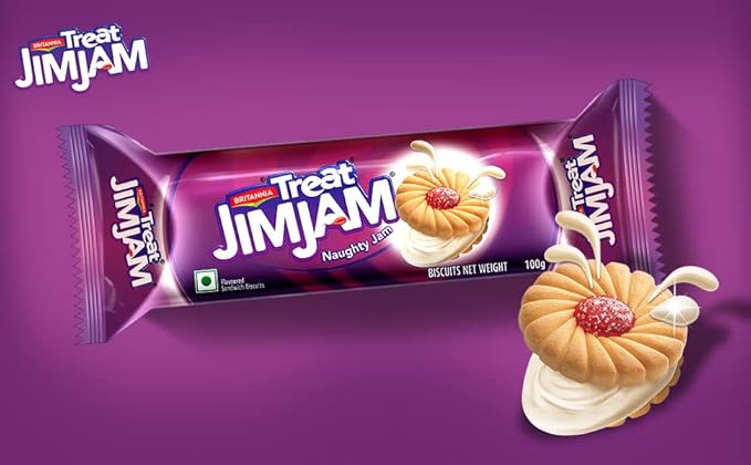 Jim Jam is a sandwich cookie with a creamy vanilla filling and a dollop of sweet jelly, coated with sugar crystals. A nostalgic favorite among children across India.