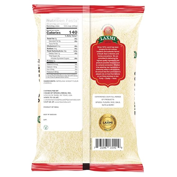 Perfect for light and fluffy preparations, Laxmi Sooji Fine is finely ground semolina made from premium wheat. Ideal for halwa, rava dosa, and quick idli mixes, it?s a pantry essential across Indian homes. Its high iron content and versatility make it a nutritious and convenient base for both sweet and savory dishes.